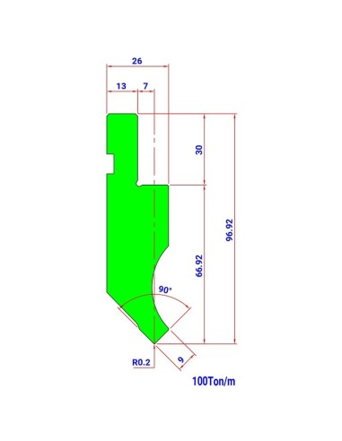 Punção 1010 IH 90º de tipo Europeu, disponível com raio de 0,2 ou 0,8mm, 67 mm de altura e ângulo de 90º.