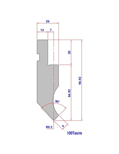 Punção 016 HR/TH 90º de tipo Europeu, com Raio de 0,2/0,6/0,8mm, 67mm de altura e ângulo de 90º.