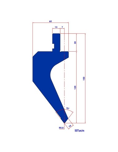Punção 047 HR 75º de tipo Europeu, com Raio de 0,8mm, 120mm de altura e ângulo de 75º.