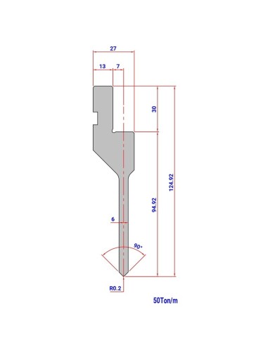 Punção 108 HR/TH 90º de tipo Europeu, com Raio de 0,2/0,6/0,8mm, 95mm de altura e ângulo de 90º.