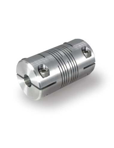 Acoplamentos obtidos a partir de uma só peça de material e com dupla espiral. Fixação por perno roscado e braçadeira. Adequado a inúmeras aplicações. Sem folga,