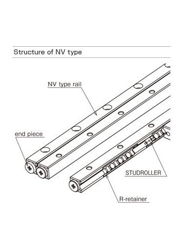A guia tipo NV compreende trilhos retificados com precisão , gaiolas de rolos de precisão R com STUDROLLER embutidos e rolos de precisão. Os trilhos foram projetados de forma ideal para que os STUDROLLERs se movam suavemente, e os STUDROLLERs e os rolos de precisão incorporados nas gaiolas R permitem uma operação sem deslizamento entre a superfície da pista e os rolos, resultando em movimento com mínima resistência ao atrito.