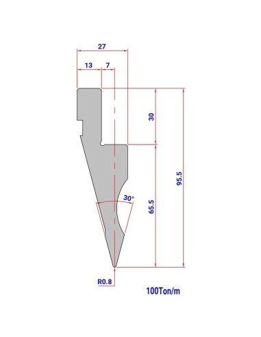 Punção 1380 HR/TH 30º de tipo Europeu, com Raio de 0,8mm, 65,5mm de altura e ângulo de 30º.