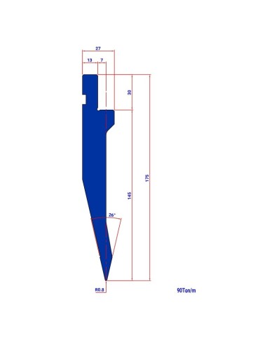 Punção S1585 HR 26º de tipo Europeu, com Raio de 0,8mm, 145mm de altura e ângulo de 26º.