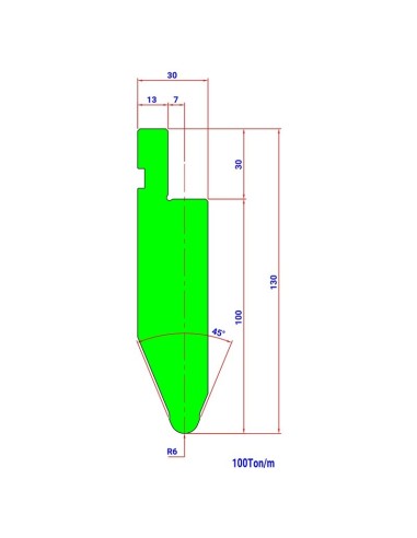 Punção 1023 IH 45º de tipo Europeu, com Raio de 6mm, 100mm de altura e ângulo de 45º.