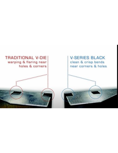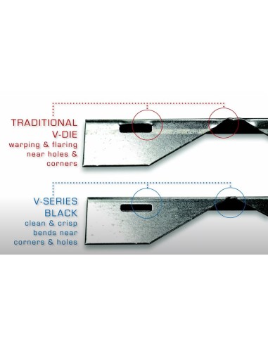 As matrizes da Série V incluem inserções incorporadas substituíveis que rodam de forma a que o material deslize sobre uma superfície plana em vez da tradicional ação de escorregamento no raio da matriz convencional. A fricção e a carga concentrada são grandemente reduzidas, o que reduz a marcação do material.