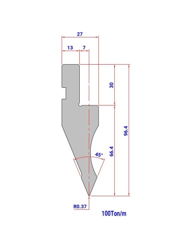 Punção 008 HR/TH 45º de tipo Europeu, com Raio de 0,37mm, 66mm de altura e ângulo de 45º.